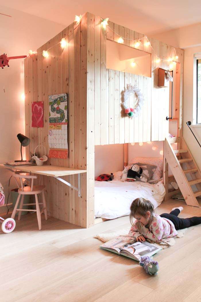 It’s an Ikea KURA bunk bed hack and so we built that in her room first. Then added a piece of sturdy plywood to the bottom so we could add a mattress on both levels of the bunk. My husband Jason used a bunch of spruce 1 x 4’s to create the paneling and then cut out a peek-a-boo window in the front. The handles that are going up the stairs are actually towel racks that I spray painted matte black.