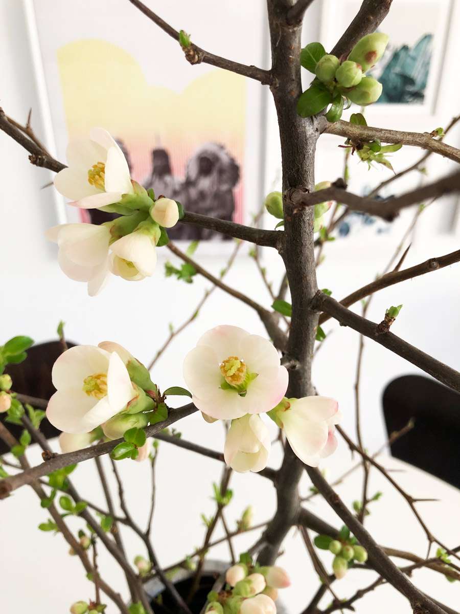 Whenever I get the winter blues, I always like heading outdoors, braving the cool air, hopping on my bike and looking for wild botanical branches I can bring inside and force a little spring. Recently I came across some quince branches (Chaenomeles speciosa) with buds and brought a few inside. Quince, along with Forsythia is one of the first blossoms that happen here in the Pacific Northwest, and which I can usually find mid February. I love their white and salmon-coloured blooms which always bring new hope to what can be a very grey month here.