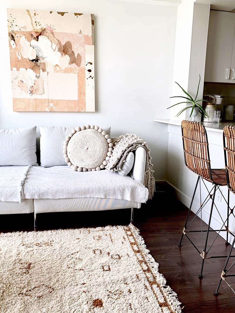 Sarah’s new body of work fits seemingly well into the rugged background of Joshua Tree, as does her home, which one can also imagine it situated there. Although based in the Mount Pleasant area of rainy Vancouver, her space exudes a lightness, with desert vibes from the palette chosen, wicker features, natural woods, collected baskets and of course surrounded by her beautiful art!